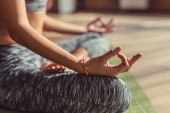 Młoda kobieta uprawia jogę z powrotem namaste poza podczas pandemii koronawirusa w salonie w domu. Medytuje na macie w porannym słońcu..