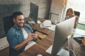 Młody, przystojny, zestresowany biznesmen pracuje nad nowym projektem w biurze. Patrzy na komputer i pije herbatę..