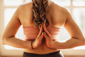 Młoda kobieta uprawia jogę Lotus mudra podczas pandemii koronawirusowej w salonie w domu. Ona medytuje w porannym słońcu.