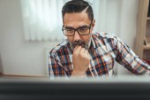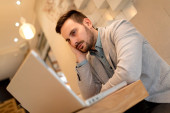 Młody, przystojny, zmęczony biznesmen relaksuje się opierając się na fotelu biurowym z zamkniętymi oczami i rękami za głową, czekając na koniec godzin pracy.