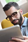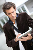 Zdjęcie "Człowiek korzystający z tabletu cyfrowego" może być wykorzystywane do celów osobistych i komercyjnych zgodnie z warunkami zakupionej licencji Royalty-free. Obraz jest dostępny do pobrania w jakości wysokiej rozdzielczości do 5760x3840.