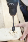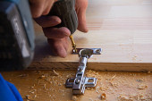 stolarz mierzy drewnianą deskę taśmą i notatki ołówkiem