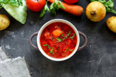 Zdjęcie "Zdjęcie jedzenia na ciemnym tle. Ręce i jedzenie dzieci. Dziecko trzyma za ręce miskę z gulaszem warzywnym. Dziecko je lunch. Jedzenie na ciemnym, betonowym tle." może być wykorzystywane do celów osobistych i komercyjnych zgodnie z warunkami zakupionej licencji Royalty-free. Obraz jest dostępny do pobrania w jakości wysokiej rozdzielczości do 5760x3840.
