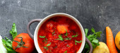 Zdjęcie jedzenia na ciemnym tle. Ręce i jedzenie dzieci. Dziecko trzyma za ręce miskę z gulaszem warzywnym. Dziecko je lunch. Jedzenie na ciemnym, betonowym tle.