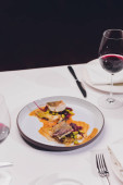 Grillowana ośmiornica z warzywami i sosem z mątwy. Restauracja, styl życia, wyżywienie turystyczne - grillowana ośmiornica z warzywami Menu restauracyjne. Włoskie świeże owoce morza.