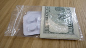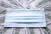 Tabletki w białym plastiku, maski medyczne i dolary na stole.