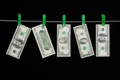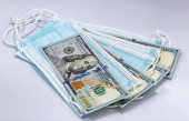 Tabletki w białym plastiku, maski medyczne i dolary na stole.