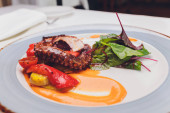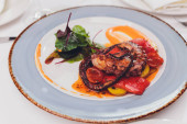 Grillowana ośmiornica z warzywami i sosem z mątwy. Restauracja, styl życia, wyżywienie turystyczne - grillowana ośmiornica z warzywami Menu restauracyjne. Włoskie świeże owoce morza.