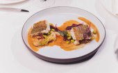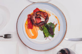 Grillowana ośmiornica z warzywami i sosem z mątwy. Restauracja, styl życia, wyżywienie turystyczne - grillowana ośmiornica z warzywami Menu restauracyjne. Włoskie świeże owoce morza.