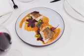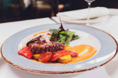 Zdjęcie "Grillowana ośmiornica z warzywami i sosem z mątwy. Restauracja, styl życia, wyżywienie turystyczne - grillowana ośmiornica z warzywami Menu restauracyjne. Włoskie świeże owoce morza." może być wykorzystywane do celów osobistych i komercyjnych zgodnie z warunkami zakupionej licencji Royalty-free. Obraz jest dostępny do pobrania w jakości wysokiej rozdzielczości do 5760x3840.