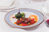 Zdjęcie "Grillowana ośmiornica z warzywami i sosem z mątwy. Restauracja, styl życia, wyżywienie turystyczne - grillowana ośmiornica z warzywami Menu restauracyjne. Włoskie świeże owoce morza." może być wykorzystywane do celów osobistych i komercyjnych zgodnie z warunkami zakupionej licencji Royalty-free. Obraz jest dostępny do pobrania w jakości wysokiej rozdzielczości do 5760x3840.