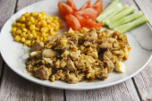Kurczak z grzybami i ryż z zielenią z sosem śmietankowym