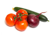Pomidor, ogórek, cebula, izolowane na białym tle.