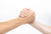 Widok dwóch mężczyzn trzymających się za ręce odizolowanych na szaro