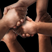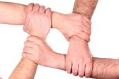 Przycięty widok mężczyzn wykonujących gest jedności dłońmi odizolowanymi na szaro