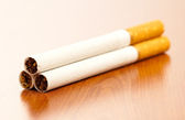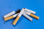 pięć papierosów i jeden wyszedł na pół tytoniu na jasnym drewnianym