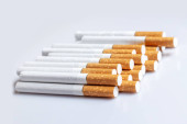 pomarańczowe papierosy ze złotą wstążką na białym tle. izolat