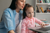 Zdjęcie "Mama i córka są dziś w domu. Pracują zdalnie na laptopie. Mama pomaga córce wykonać zadania na komputerze." może być wykorzystywane do celów osobistych i komercyjnych zgodnie z warunkami zakupionej licencji Royalty-free. Obraz jest dostępny do pobrania w jakości wysokiej rozdzielczości do 5760x3840.