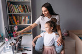 Zdjęcie "Mama i córka są dziś w domu. Pracują zdalnie na laptopie. Mama pomaga córce wykonać zadania na komputerze." może być wykorzystywane do celów osobistych i komercyjnych zgodnie z warunkami zakupionej licencji Royalty-free. Obraz jest dostępny do pobrania w jakości wysokiej rozdzielczości do 5760x3840.