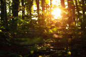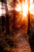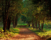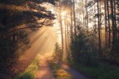 Ścieżka w iglastym letnim parku botanicznym pośród świerku w świetle zachodu słońca
