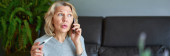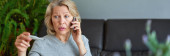Happy Dojrzałe kobieta za pomocą telefonu komórkowego podczas siedzenia na kanapie w domu.