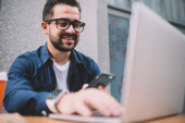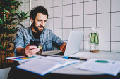 Zdjęcie "Szczęśliwy brodaty hipster blogger w stylowych okularach optycznych do korekcji wzroku czytanie publikacji internetowej z dobrymi informacjami na temat urządzenia smartfona siedzi na laptopie w przestrzeni coworking" może być wykorzystywane do celów osobistych i komercyjnych zgodnie z warunkami zakupionej licencji Royalty-free. Obraz jest dostępny do pobrania w jakości wysokiej rozdzielczości do 5760x3840.