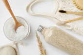 Makarony, płatki owsiane i precle w szklanych słoikach na białym tle na kuchni.Zapasy niepsujących się produktów na jasnym tle.Zorganizowany dom proste stylowe przechowywanie bez plastiku, zero odpadów.