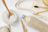Makaron, płatki owsiane, precle, cukier i herbata w szklanych słoikach na białym tle na kuchni.Zapasy niepsujących się produktów. Zorganizowany dom proste stylowe przechowywanie bez tworzyw sztucznych, zero odpadów.