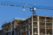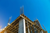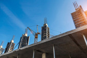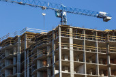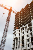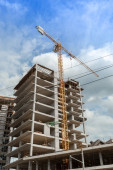 Rozległe rusztowania zapewniające platformy do prac w toku na nowym bloku mieszkalnym, Wysoki budynek w budowie z rusztowaniami, Wolnostojący żuraw wieżowy na placu budowy