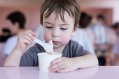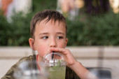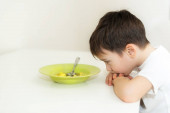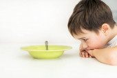Chłopak nie chce jeść. Siedzi przy stole, talerz zupy stoi przed nim..