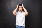 Młody azjatycki biznesmen krzyczący, wściekły wyraz twarzy. Frustracja związana ze stresem w koncepcji biznesu