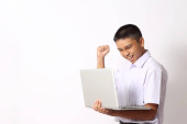 Młody azjatycki biznesmen w białej koszuli patrzący na laptopa, wygrywający gest. Zbliżenie portret ciała, niebieskie tło