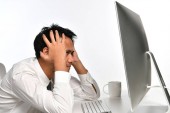 Portret młodego azjatyckiego biznesmena wyglądał na zmęczonego i cierpiał na sztywny ból głowy po zbyt długiej pracy na laptopie.
