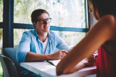 Zdjęcie "Spotkanie dwóch przyjaciół przy stoliku kawowym w kawiarni.Pozytywny casual ubrana młoda kobieta komunikująca się z hipsterem facet ubrany dorywczo strój o wspólnym projekcie projektu.Współpraca dwóch studentów" może być wykorzystywane do celów osobistych i komercyjnych zgodnie z warunkami zakupionej licencji Royalty-free. Obraz jest dostępny do pobrania w jakości wysokiej rozdzielczości do 5760x3840.