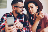 Zamyślony młody mężczyzna i kobieta instalujący aplikację na urządzeniu mobilnym za pomocą darmowego Internetu 4G. Kaukascy blogerzy aktualizujący profil na stronie internetowej i pobierający media na smartfonie siedzącym razem w kawiarni