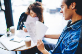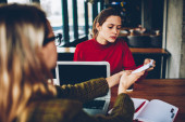 Zdjęcie "Portret hipstera dzwoniącego na smartfona podczas współpracy nad wspólnym projektem z młodą białą kobietą, która patrzy na smartwatch i sprawdza zegar, aby mieć czas na ostateczny termin" może być wykorzystywane do celów osobistych i komercyjnych zgodnie z warunkami zakupionej licencji Royalty-free. Obraz jest dostępny do pobrania w jakości wysokiej rozdzielczości do 5760x3840.
