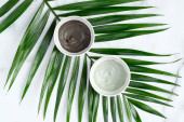 Zielone i czarne maski gliniane z tropikalnym liściem palmy, grzebieniem do włosów, gąbką gąbką i muszelkami na marmurowym tle. SPA naturalne kosmetyki ekologiczne do pielęgnacji twarzy lub włosów, pielęgnacji skóry