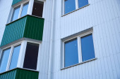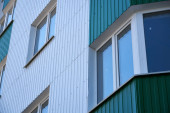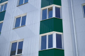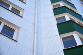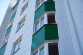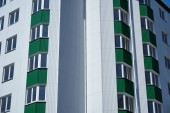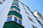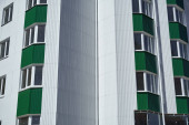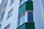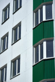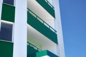 elewacja nowego wielopiętrowego budynku z białą i zieloną metalową bocznicą, wiele okien