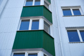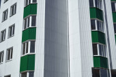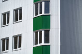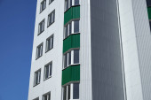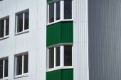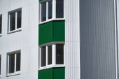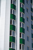 elewacja nowego wielopiętrowego budynku z białą i zieloną metalową bocznicą, wiele okien