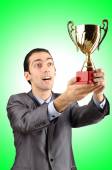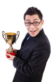 Biznesmen nagrodzony puchar nagród izolowane na białym