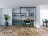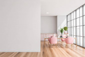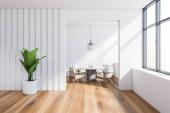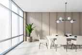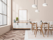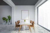 Wnętrze stylowej jadalni z białymi ścianami, drewniana podłoga, wygodny okrągły stół z białymi fotelami i pionowy plakat makiety. Okno z zamazanym krajobrazem miasta. 3d renderowanie