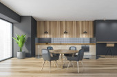 Zdjęcie "Widok z przodu nowoczesnej jadalni z szarymi ścianami, drewniana podłoga, wygodny okrągły stół z beżowymi fotelami i roślin doniczkowych na pierwszym planie. Okno z zamazanym krajobrazem miasta. 3d renderowanie" może być wykorzystywane do celów osobistych i komercyjnych zgodnie z warunkami zakupionej licencji Royalty-free. Obraz jest dostępny do pobrania w jakości wysokiej rozdzielczości do 5760x3840.