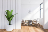 Widok z przodu nowoczesnej jadalni z szarymi ścianami, drewniana podłoga, wygodny okrągły stół z beżowymi fotelami i roślin doniczkowych na pierwszym planie. Okno z zamazanym krajobrazem miasta. 3d renderowanie