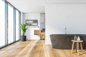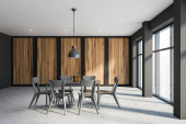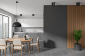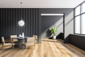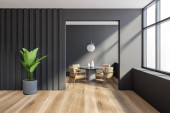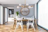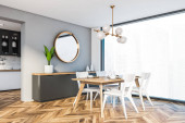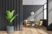 Zdjęcie "Wnętrze stylowej jadalni z szarymi ścianami, drewnianą podłogą, wygodnym okrągłym stołem z beżowymi fotelami i pionowym plakatem makiety. Okno z zamazanym krajobrazem miasta. 3d renderowanie" może być wykorzystywane do celów osobistych i komercyjnych zgodnie z warunkami zakupionej licencji Royalty-free. Obraz jest dostępny do pobrania w jakości wysokiej rozdzielczości do 5760x3840.