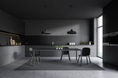 Wnętrze nowoczesnej kuchni z białymi i ciemnoszarymi ścianami, szarymi blatami i szafkami, wyspiarskim i ciemnodrewnianym stołem z krzesłami. 3d renderowanie