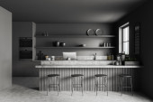 Zdjęcie "Wnętrze nowoczesnej kuchni z białymi i ciemnoszarymi ścianami, szarymi blatami i szafkami, wyspiarskim i ciemnodrewnianym stołem z krzesłami. 3d renderowanie" może być wykorzystywane do celów osobistych i komercyjnych zgodnie z warunkami zakupionej licencji Royalty-free. Obraz jest dostępny do pobrania w jakości wysokiej rozdzielczości do 5760x3840.