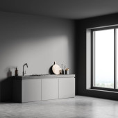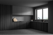Wnętrze komfortowej kuchni z szarymi ścianami, betonową podłogą, szarymi blatami z wbudowanym zlewem i kuchenką oraz ciemnodrewnianymi szafkami. Okno z zamazanym widokiem na góry. 3d renderowanie