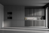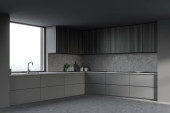 Zdjęcie "Wnętrze komfortowej kuchni z szarymi ścianami, betonową podłogą, szarymi blatami z wbudowanym zlewem i kuchenką oraz ciemnodrewnianymi szafkami. Okno z zamazanym widokiem na góry. 3d renderowanie" może być wykorzystywane do celów osobistych i komercyjnych zgodnie z warunkami zakupionej licencji Royalty-free. Obraz jest dostępny do pobrania w jakości wysokiej rozdzielczości do 5760x3840.