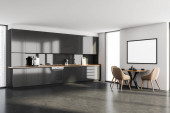 Narożnik stylowej kuchni z szarymi i kamiennymi ścianami, szarymi blatami, ciemnodrewnianymi szafkami i wygodnym stołem jadalnym. Okno z zamazanym widokiem na góry. Pionowy plakat makiety. 3d renderowanie