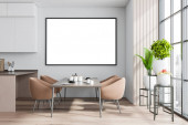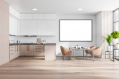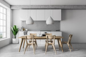 Wnętrze stylowej jadalni z białymi i drewnianymi ścianami, drewniana podłoga, długi stół z beżowymi fotelami i roślinami na półkach w pobliżu okna z zamazanym krajobrazem miejskim. 3d renderowanie